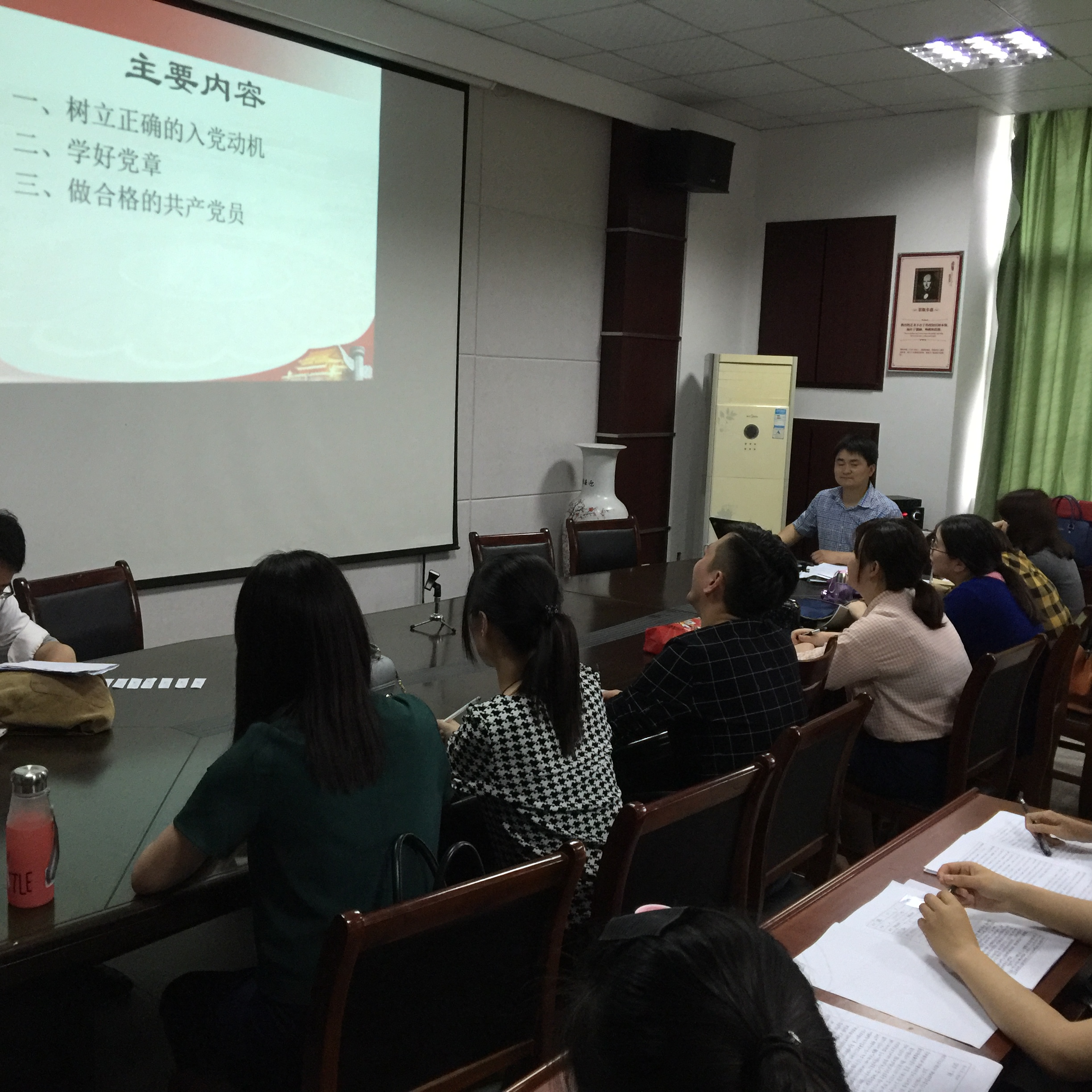 最后他强调“端正入党动机,学好党章,做合格党员”不仅要作为我们党员入党前奋斗的目标,也应该是我们一生奋斗的目标。 要端正入党动机就必须首先要认真学习党的理论和基本知识,原原本本地学习党章,对党的宗旨、党的纲领、奋斗目标、党的政治、思想、组织路线等等都要了解,要学习、要掌握、要牢记,向优秀党员学习,要努力把成为一名优秀的共产党员作为奋斗目标。处处发挥党员应有的先锋、骨干、纽带作和模范作用。
