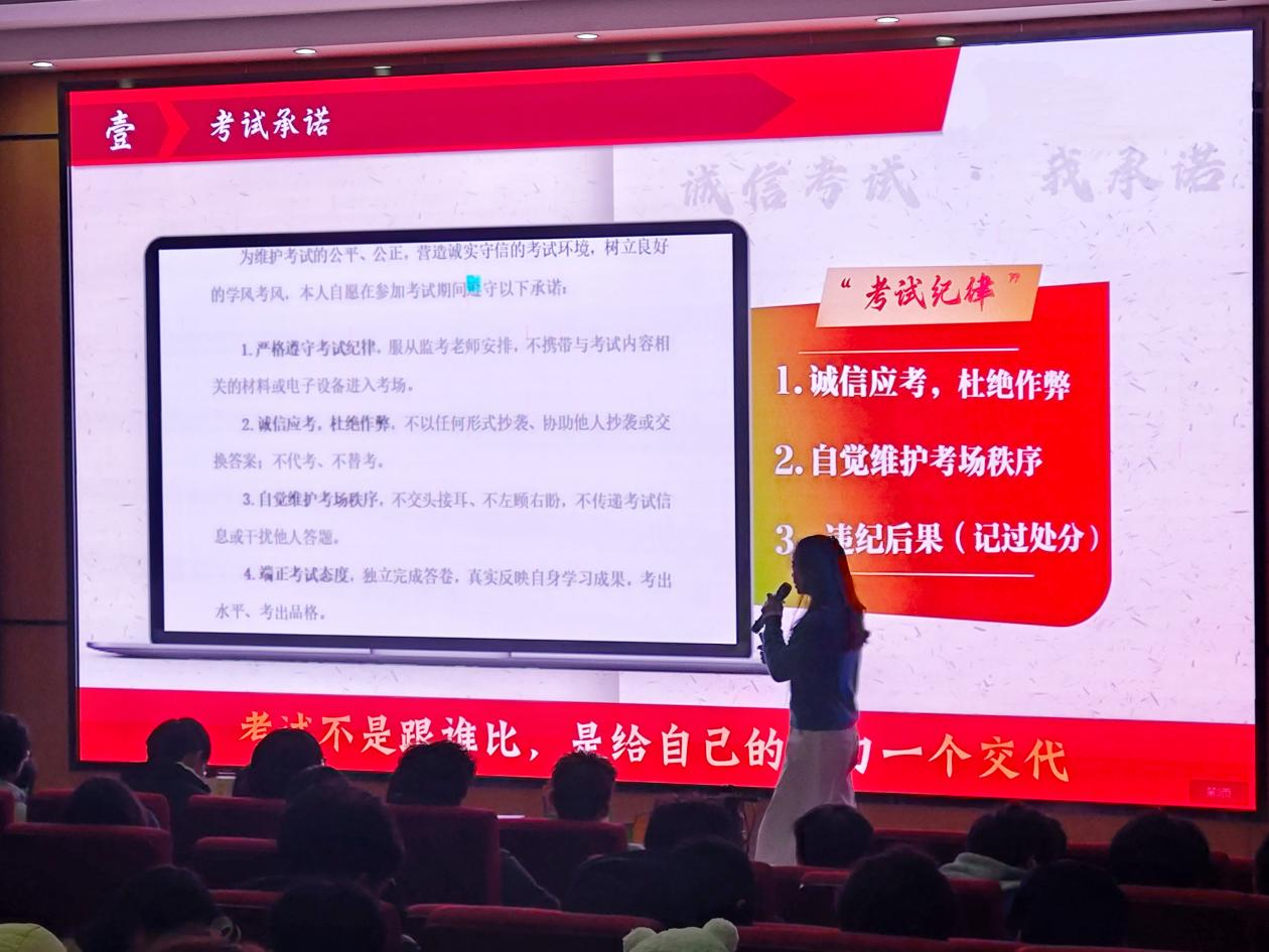 诚信是立身之本,本次班会首重诚信考试教育。辅导员徐亚兰、程倩倩分别重申考场纪律,明确考试承诺书约束力,要求严禁携带违规电子设备及资料入场,提前备齐有效证件。同时梳理各类作弊行为,强调其严重后果,呼吁同学们端正态度,诚信应考,圆满收官学期学习。