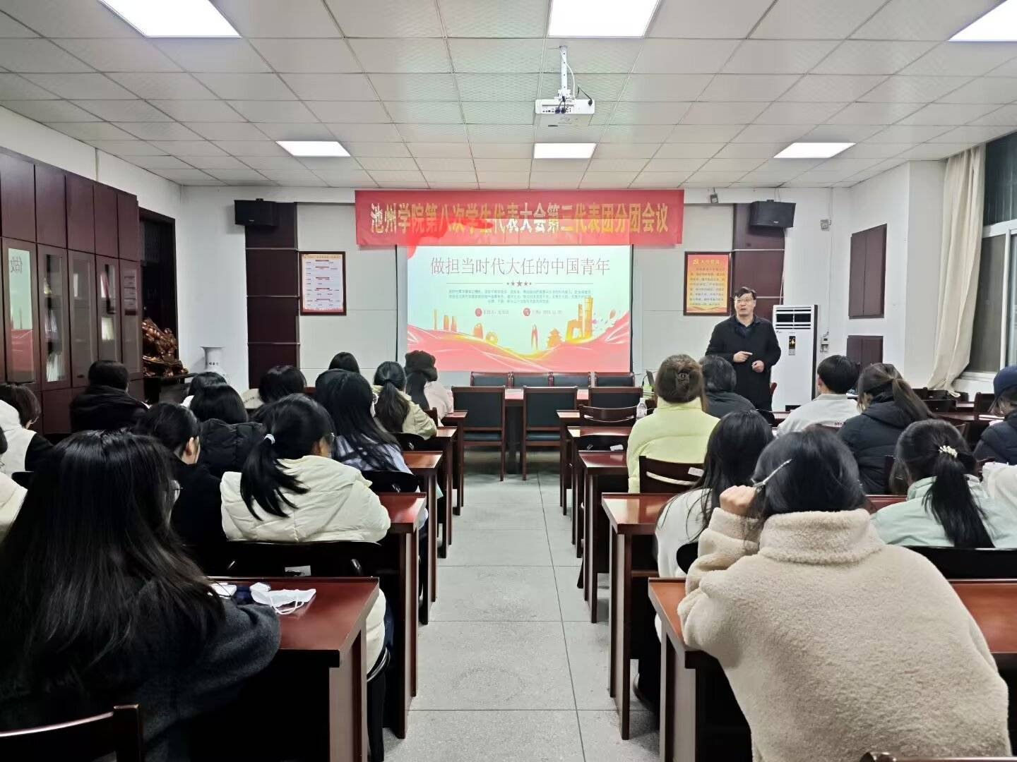 为着力培养“政治过硬、理论扎实、能力突出”的青年马克思主义者,引导广大青年勇担时代重任。11月20日晚7点,外国语学院于博学楼会议室成功举办池州学院第三十二期青马工程培训班第二次课程。本次课程由外国语学院党委书记张乐民老师主讲,学院全体青马班学员参与。