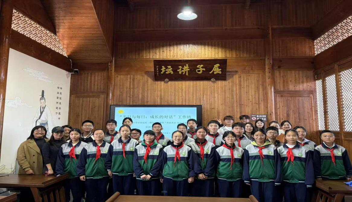 在屈子讲堂,项目组以“‘半日与每日:成长的对话’工作坊”为主题开展了课程教学活动。池州学院外国语学院的大学生们通过情景模拟重现Half a Day故事场景,突出“半日”对人的一生成长变化的重要意义。池州市第十一中学的学生们通过故事写作以及故事复述,回顾开启的初中生活,发现自身发生的变化,总结初中生活的独特印记与成长收获。在课程教学过程中,大学生和中学生形成了紧密合作的学习共同体,将“变化”、“时间”和“成长”等抽象概念转化为可见、可知的具体实践场景,在故事展演和课堂互动中思考个人的成长。最后,在大学生的帮助下,中学生们对一年后的自己送出了成长寄语,期待未来遇到更好的自己。