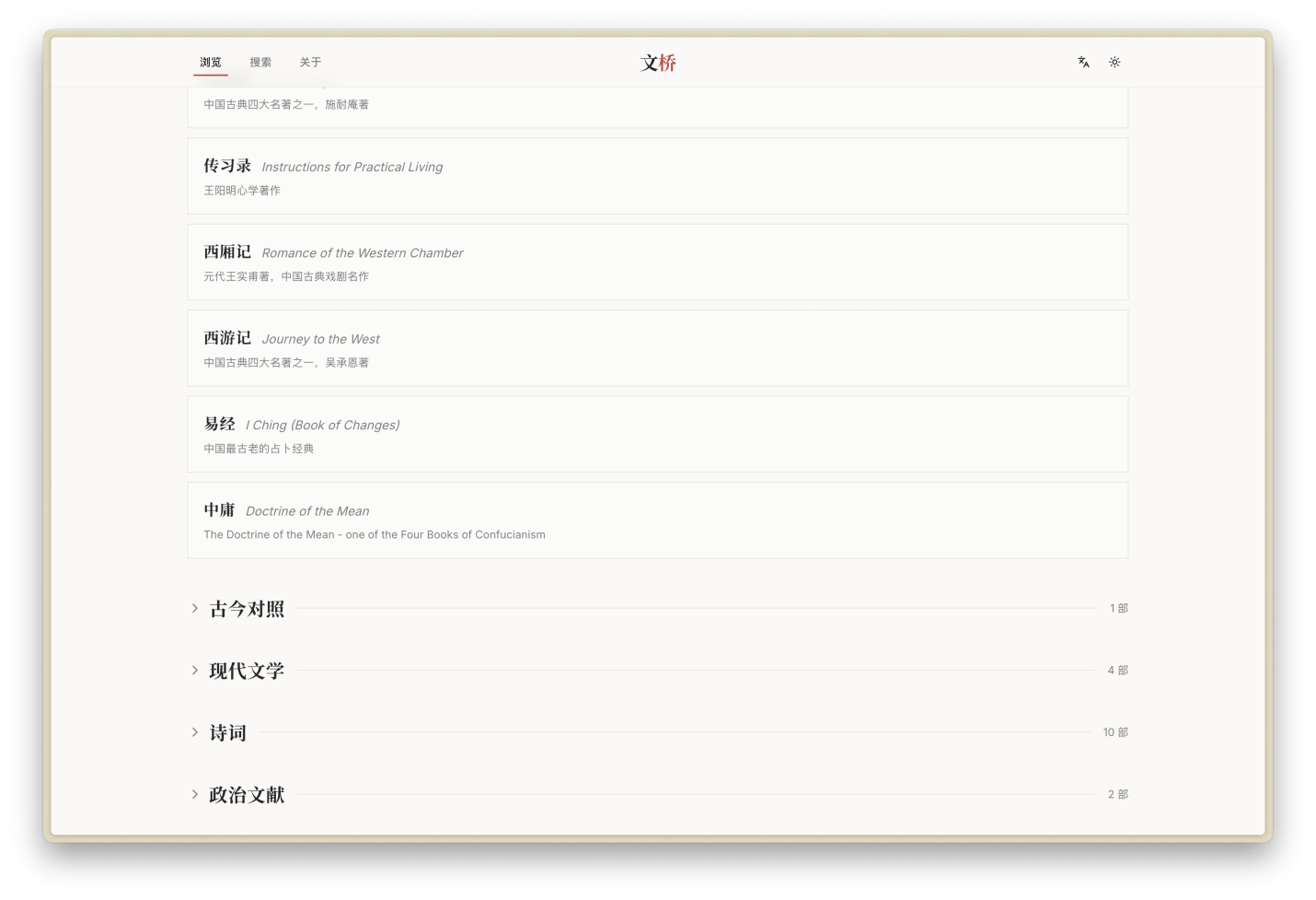 “文桥”寓意“以文为桥,连接中西”,是一个面向学术研究与教学实践的大规模中英平行语料库。平台目前收录了超过270万条中文句段与280万条英文译本,涵盖37部经典作品,涉及50余位中外译者的翻译成果,构建了一个跨越古今、兼顾雅俗的翻译资源生态。