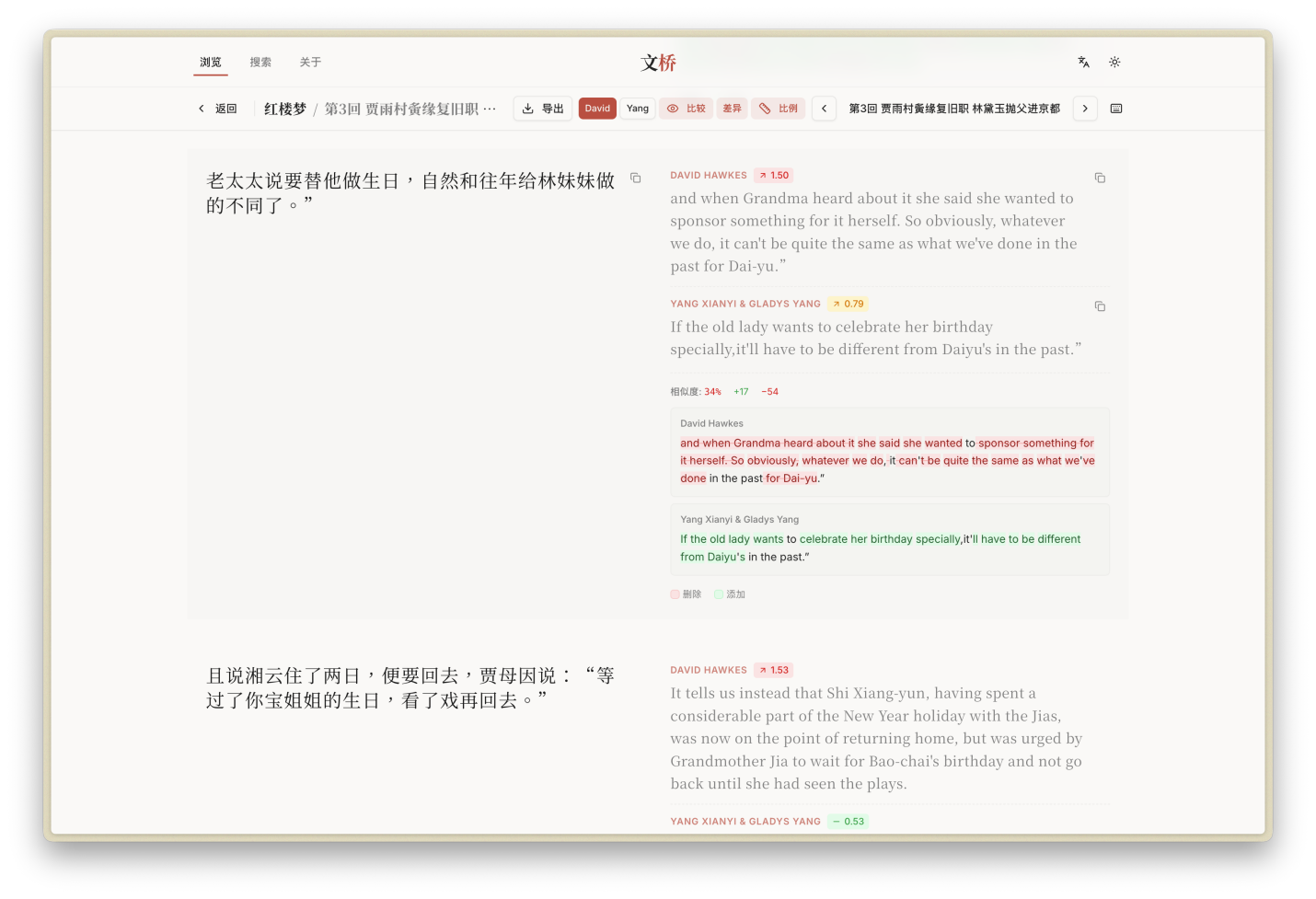 区别于传统的单译本语料库,“文桥”将多译本对照作为核心功能亮点。以《红楼梦》为例,平台完整收录了大卫·霍克斯(David Hawkes)与杨宪益、戴乃迭夫妇两个权威英译本,共计4万余条句段。研究者可以同屏逐句对比两位译者在处理同一文本时的翻译策略、修辞选择与风格差异,极大地便利了翻译批评研究。
